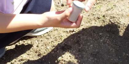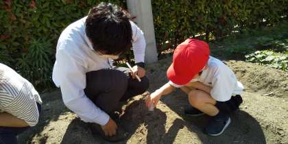 和田萬商店の高見さん、石橋さんをゲストティーチャーにお招きして、金ゴマの種まきを行いました。ゴマにまつわるクイズをしていただき、1粒のゴマから8000粒のゴマができることを知った子どもたちは「よ〜し!がんばって育てるぞ!」とやる気満々です。学習園では、和田萬商店お手製の種まきマシーン(まん中の写真)を使って、一人3か所ずつ種まきをしました。3〜4か月後にはりっぱなゴマが収穫できることを目標にこれからお世話をがんばっていきたいと思います。