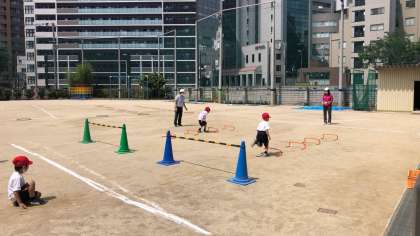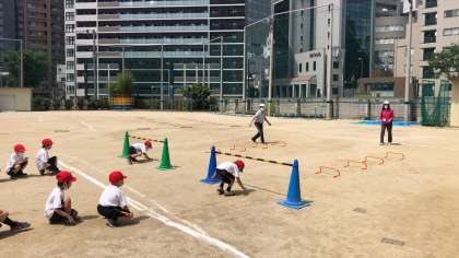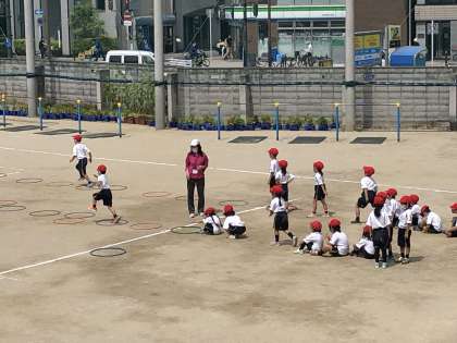 今日は、運動場で、ミニハードルを跳んだり、フープをケン・パーして跳んだりしました。1年生の時期は、日常生活にはない多様な活動を通して体幹を鍛えたり、運動に親しみ楽しみながら活動したりすることが重要です。