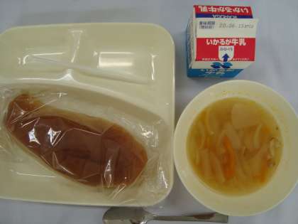 「てぼ豆のスープ、黒糖パン、牛乳」