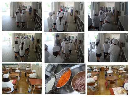 給食当番は、距離をとって、給食室にパン、おかず、牛乳、食器をとりに行きます。