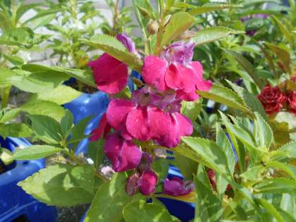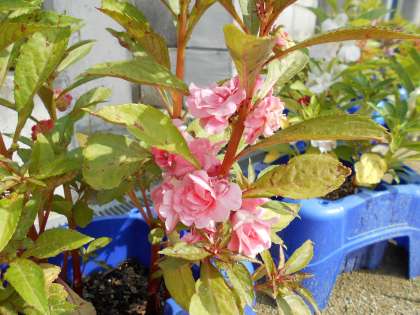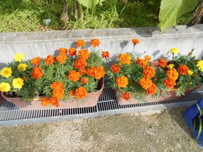 児童たちのホウセンカが開花を始めました。白・ピンク・赤・紫ときれいな花が咲いています。成長が早くて,開花が終わりかけのものもあります。マリーゴールドは満開です。