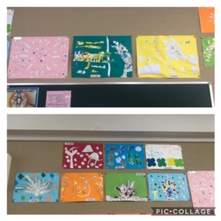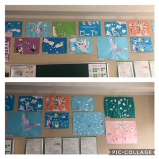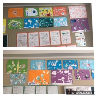 4年生の教室の掲示板に図工で描いた作品が掲示しています。
