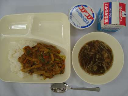 「和風カレー丼、もずくとオクラのとろり汁、ヨーグルト、牛乳」