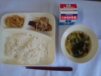 「豚肉の甘辛焼き、すまし汁、切干しだいこんのいため煮、ごはん、牛乳」
