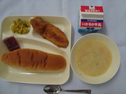 「サーモンフライ、豆乳スープ、キャベツのカレーソテー、コッペパン、いちごジャム、牛乳」
