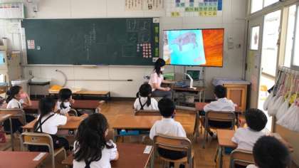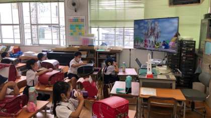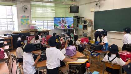 1年生の終わりの会では、英語の動画を観たり、担任の先生が読み聞かせをしてくれています。