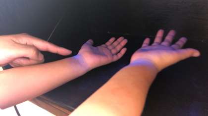 手洗い指導では、特殊な液を手につけてから手を洗いました。そして、洗った手をブラックライトに当てると、洗い残したところが青く光ります。洗い残しが目で見て分かるので、「もっと、しっかり洗わないといけない」と自覚することができました。