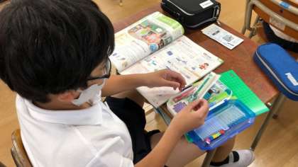 そして、今日は、針に糸を通しました。本校では、電子黒板を上手く活用し、子どもたちに先生の手元が見えるようにしています。子どもたちも先生の手元が見えるので、安心して実習していました。