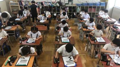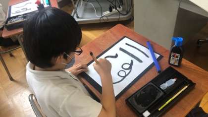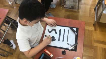 今日は、学校ではじめて習字をしました!筆の持ち方や腕の使い方などを担任の先生から指導を受けていました。さっそく、墨液をつけて、いろいろな線を書きました。