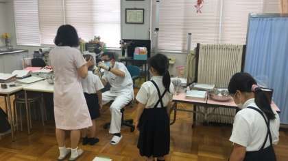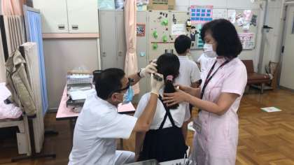 今日は、学校医の恩地先生が4・5・6年生の児童の耳、鼻、喉の検診をしてくださいました。明日は、1・2・3年生の児童を診ていただきます。