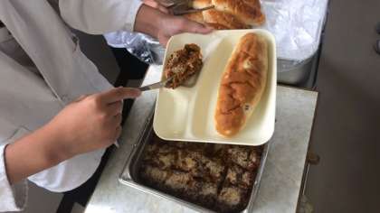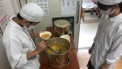 余りが出ないように均等に配るのは、至難の技です。半分で何人入れるか、4分の1で何人入れるかなどを考えながら、当番の人がおかずを入れていきます。量を計算して、割っていくのは、算数の思考力が必要です。
