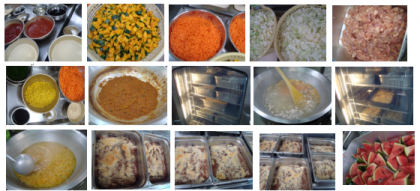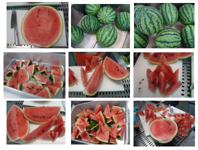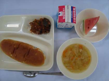 「かぼちゃのミートグラタン スープ すいか おさつパン 牛乳」