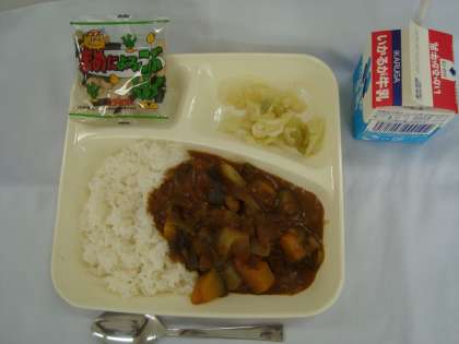 「夏野菜のカレーライス キャベツのサラダ 豆こんぶ 牛乳」