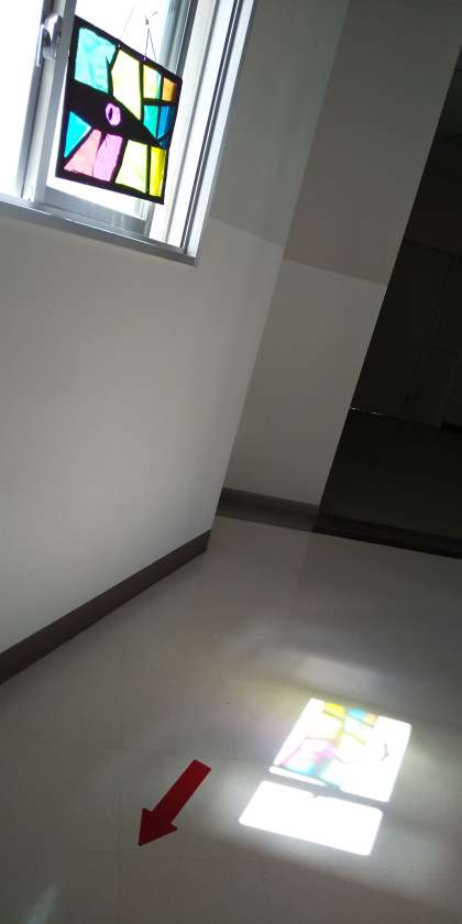 図工で製作した「光のプレゼント」に太陽の光が当たり、床に美しい 模様を写し出しています。