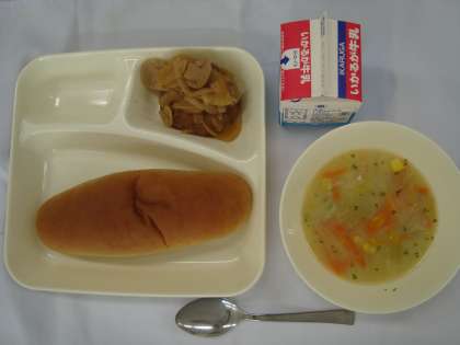 「煮こみハンバーグ コーンスープ 黒糖パン 牛乳」