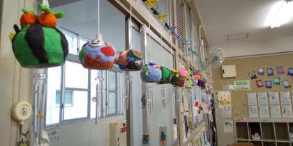 図工で製作した「風鈴」に風が当たり涼しげな音を響かせています。暑い暑い教室です。が、風鈴の音に癒されながら学習しています。「いい音〜」「オルゴールみたい〜」と音を楽しんでいます。もうすぐおうちに持って帰ります。夏の間、音を楽しんでください。