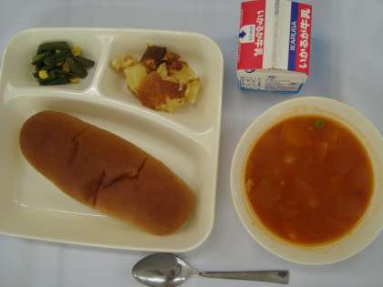 「ケチャップ煮 三度豆とコーンのソテー りんごのクラフティ 黒糖パン 牛乳」