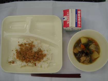 「鶏肉とじゃがいもの煮もの 紅さけそぼろ ごはん 牛乳」