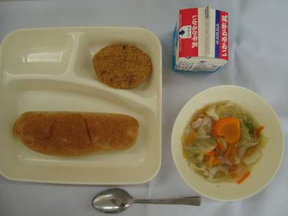 「チキンレバーカツ スープ ライ麦パン 牛乳」
