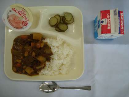 「牛肉と大豆のカレーライス(米粉のカレールウを使用) きゅうりのピクルス りんごゼリー 牛乳」