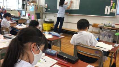 数をブロックに置き換えて、問題を解いていました。1年生では、数字を具体物に置き換えて計算して、数に慣れていきます。