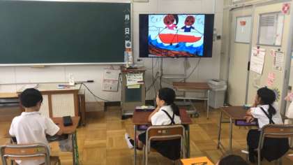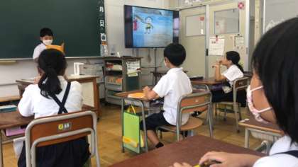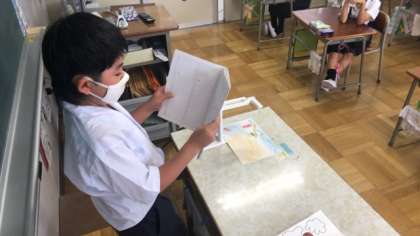 夏休みの思い出を絵にしました。絵をみんなに見せながら、そのときの様子を説明しました。説明する人は、夏休みの出来事を楽しそうに話していました。