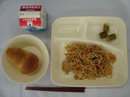 「オイスターソース焼きそば オクラの甘酢あえ ロールパン 牛乳」