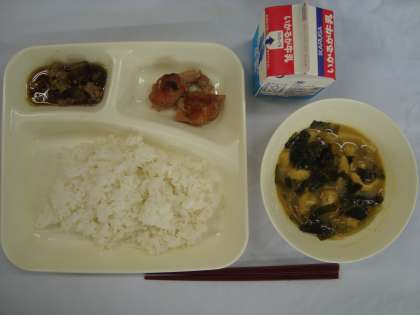 「鶏肉のてり焼き みそ汁 なすのそぼろいため ごはん 牛乳」