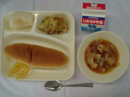 「豆乳マカロニグラタン(米粉) トマトスープ なし(二十世紀) パン マーマレード 牛乳」