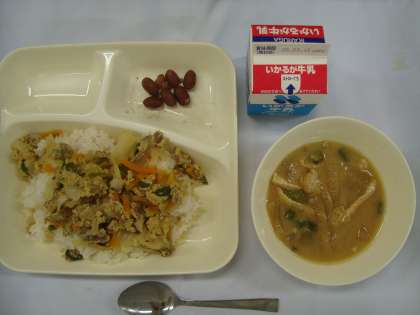 「他人丼(鶏卵の除去対応献立) とうがんのみそ汁 金時豆の煮もの ごはん 牛乳」