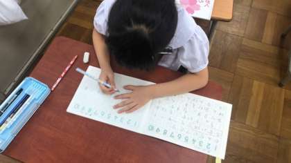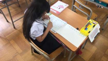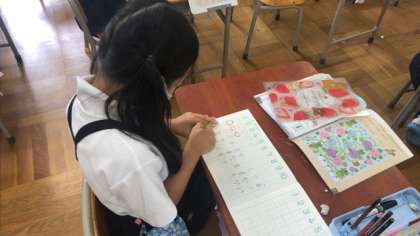 「5−3=2」のひき算の式になるように問題作りをしました。ひき算を理解していないと問題文は、作れません。習得した知識を活用することにより、知識が再構築されていきます。ご家庭でも問題作りをして楽しみながら学習させてください。
