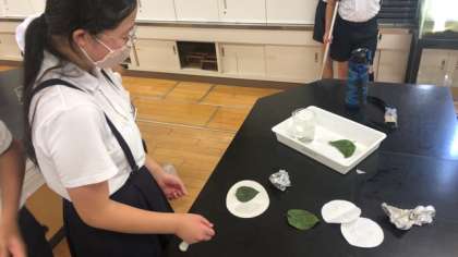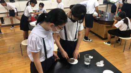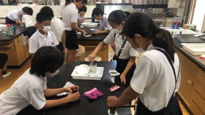理科の実験をしました。葉を日光に当てた場合と日光に当てない場面では、デンプン量に違いがあるのか調べました。