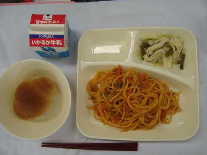 「イタリアンスパゲッティ グリーンアスパラガスのキャベツのサラダ パン 牛乳」