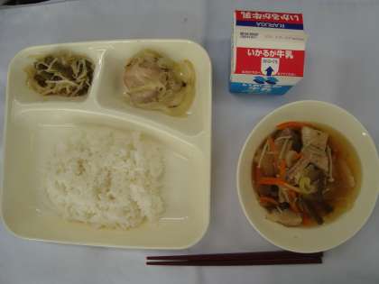 「鶏肉のゆず塩焼き ソーキ汁 もやしとさんどまめの甘酢あえ ごはん 牛乳」