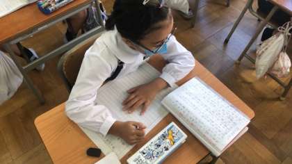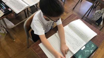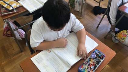今日は、教科書に描いてある絵を見て想像したことから、「時」「場所」「人物」を設定し、物語を書きました。