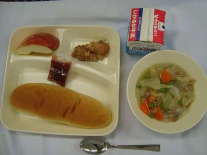 「鶏肉のガーリック焼き 豚肉と野菜のスープ煮 りんご 牛乳」