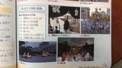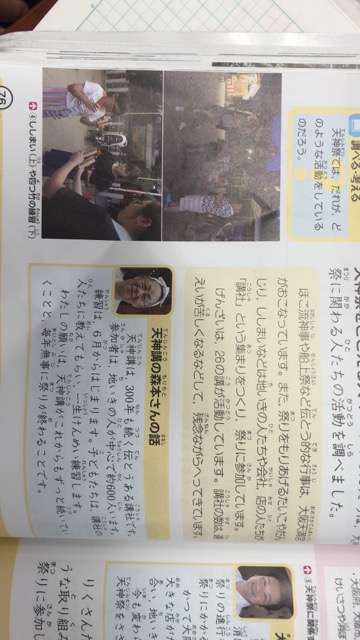 今日は、天神祭について学習しました。大阪市のすべての4年生が使用している「わたしたちの大阪」に四つ竹の練習をしている本校4年生の児童が写っていました!