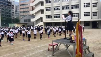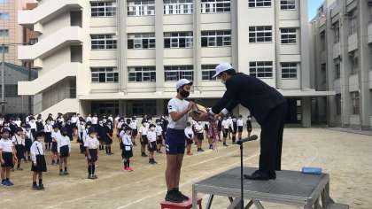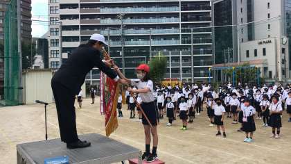 本日、西天満スポーツ大会の閉会式を行いました。徒競走とドッジボールの得点の結果、今年は赤組が優勝しました。