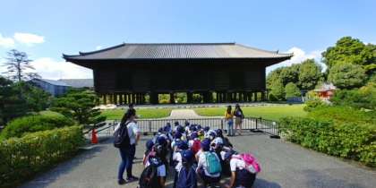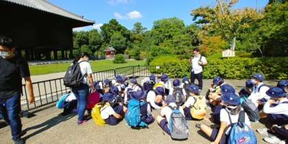 正倉院を見学しています。正倉院の中は見ることはできませんが、飛鳥、奈良時代の宝物が保管されていることを担任の先生から説明を受けていました。6年生の社会の教科書に載っている「螺鈿紫檀五絃琵琶」も保管されています。