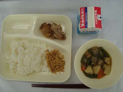 「豚肉のねぎしょうゆ焼き ふきよせ煮 ツナ大豆そぼろ ごはん 牛乳」