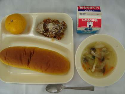 「なすのミートグラタン 鶏肉と野菜のスープ みかん パンプキンパン 牛乳」