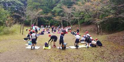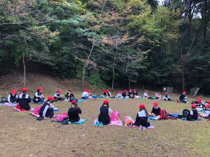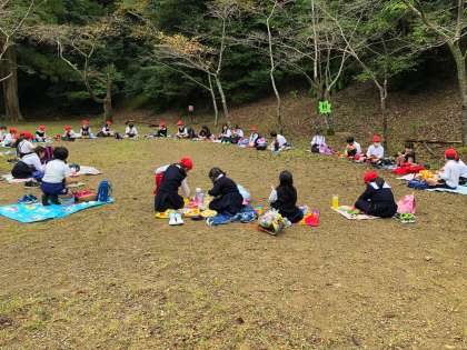 クラスごとに大きな円を作って、昼食をいただきます。雨の心配は無さそうです。