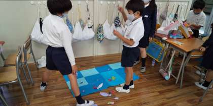 身近にあるものを使って動くおもちゃを作り、おもちゃの動きのおもしろさや不思議さに気付きました。また、遊びの中で、友達と進んでかかわり、 遊びを工夫したり、楽しんだりすることができました。