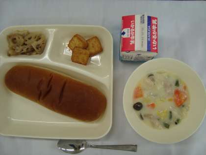 「はくさいのクリーム煮 あつあげのピリ辛じょうゆかけ 豚肉とれんこんのオイスターソースいため 黒糖パン 牛乳」
