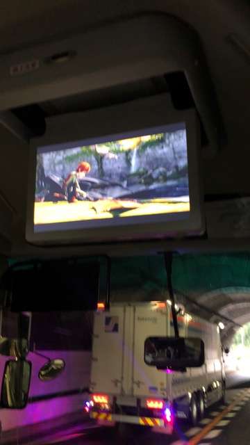 バスの中は、DVDに夢中です。