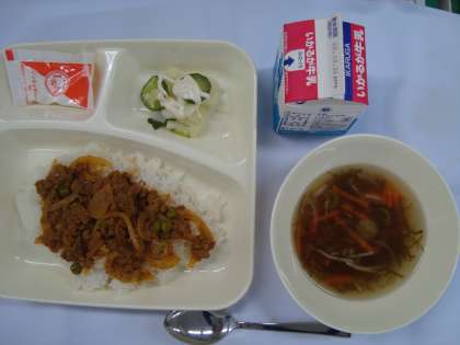 「タコライス もずくのスープ じゃがいもときゅうりのサラダ(ノンエッグドレッシング) 牛乳」
