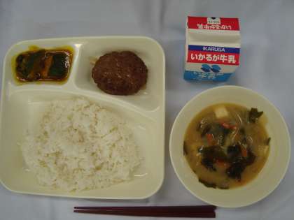 「和風ハンバーグ みそ汁 かぼちゃのいとこ煮 ごはん 牛乳」