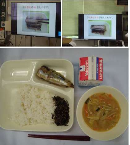 「さんまのみぞれかけ みそ汁 牛ひじきそぼろ ごはん 牛乳」