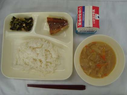 「おかうおのしょうゆだれかけ みそ汁 こまつなのいためもの ごはん 牛乳」
