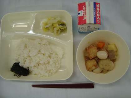 「関東煮(個別対応献立:うずら卵) はくさいの甘酢あえ のりのつくだ煮 ごはん 牛乳」